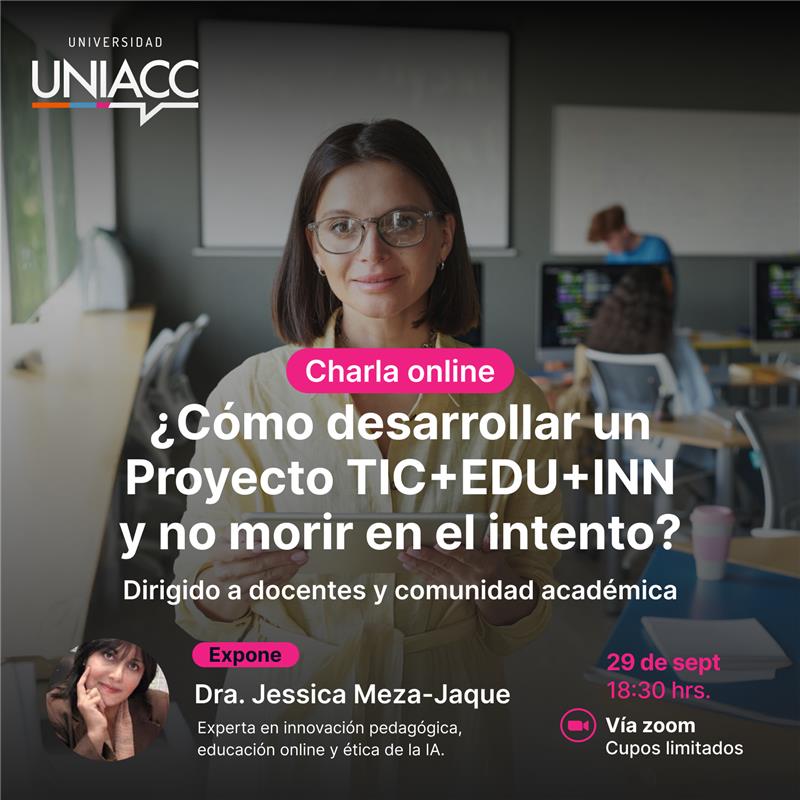 ¿Cómo pasar de una buena idea a un proyecto educativo con impacto? Esa fue la pregunta que guió la Masterclass organizada por la Subdirección de Desarrollo Docente e Innovación de UNIACC y encabezada por la Dra. Jessica Meza-Jaque.