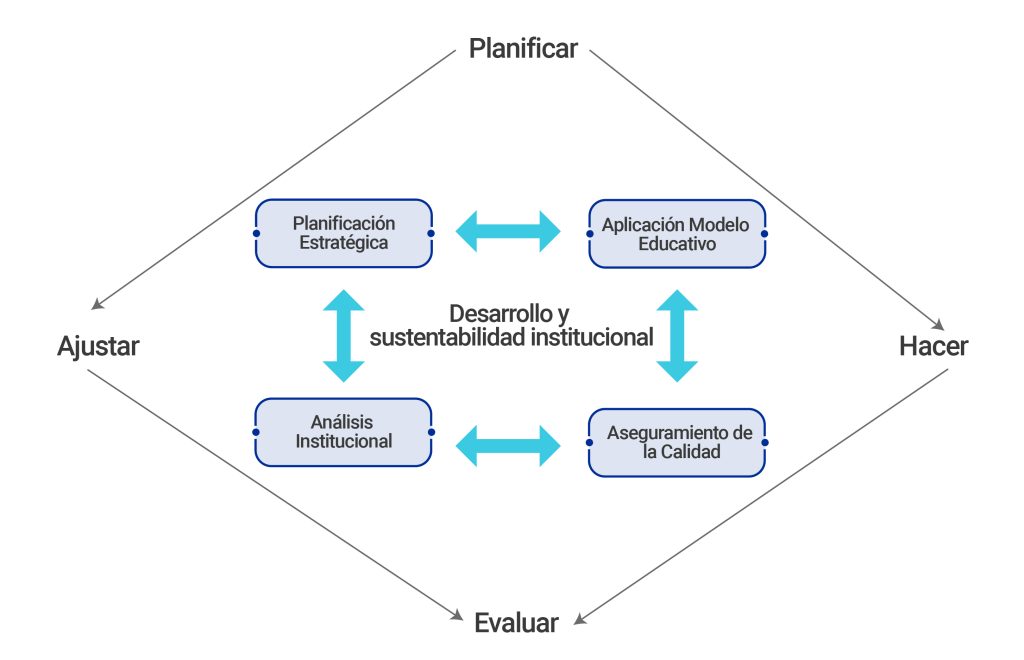 Para el aseguramiento de la calidad en la Universidad, se busca articular adecuadamente los macro-procesos de Planificación Estratégica, Aplicación del Modelo Educativo, Análisis Institucional y Aseguramiento de Calidad, con las cuatro fases del sistema tal como se explica en la siguiente figura: